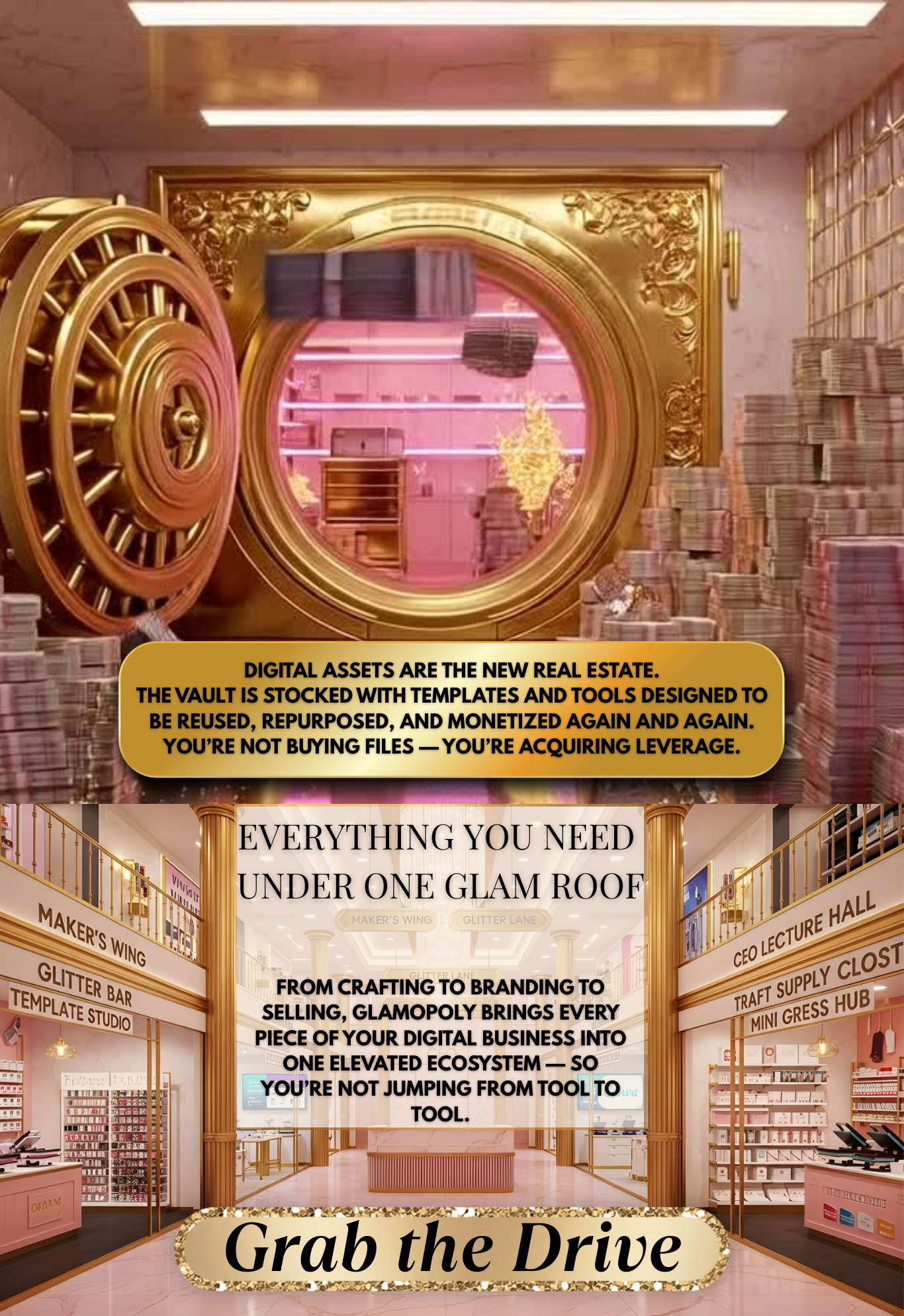 Glamopoly Empire is a luxury, all-in-one digital template vault created for crafters, creators, and digital entrepreneurs ready to design, sell, and scale year-round.