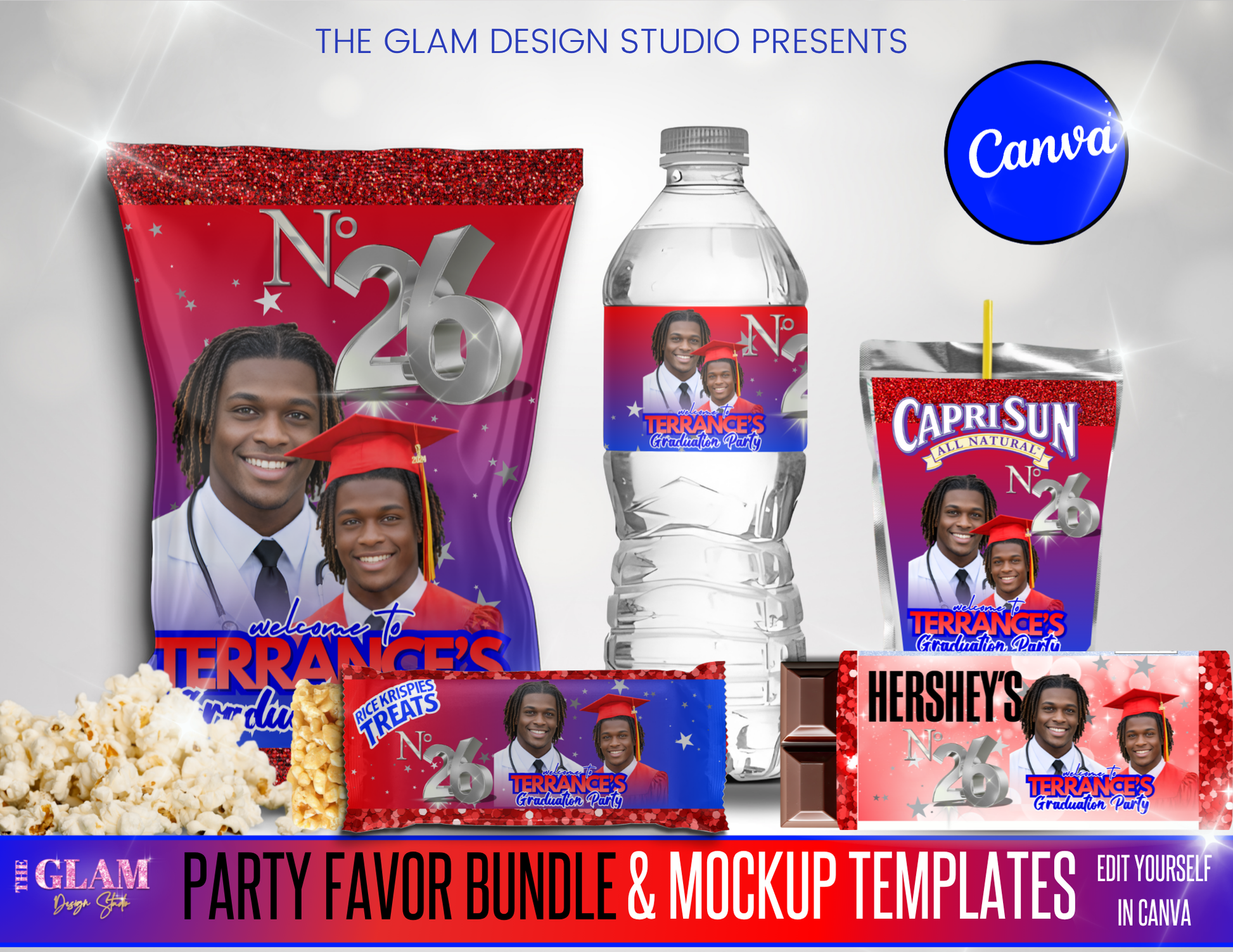 Graduation Party Favor Templates Bundle Canva | Editable Chip Bag, Capri Sun, Water Bottle, Candy Wrappers, Rice Krispie, Keychain, Perfume Labels | Class of 2026